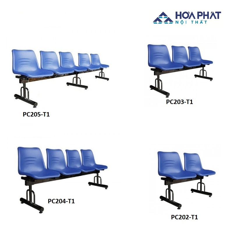 Ghế phòng chờ Hòa Phát PC(202, 203, 204, 205)T1 từ 2 đến 5 chỗ ngồi có thiết kế gồm băng ghế dài với khung thép sơn tĩnh điện bền đẹp, chắc chắn. Mặt ngồi bằng nhựa cao cấp tựa lưng có khoảng trống ở giữa tạo sự thông thoáng, mát mẻ khi tựa lưng. Ghế có màu xanh tôn thêm vẻ đẹp cho khu vực chờ.