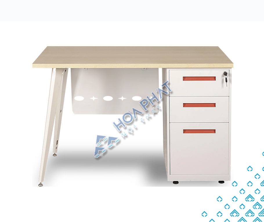 - Bàn thiết kế với kiểu dáng chân chữ V khá đẹp kết hợp cùng với tủ tài liệu sắt di động. Tủ tài liệu 3 ngăn với tay nắm màu cam nổi bật.