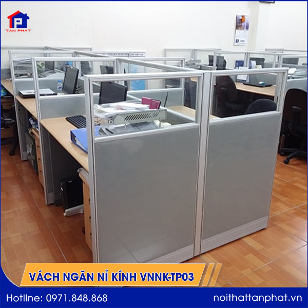 Vách ngăn văn phòng nỉ kính VNNK-TP03 sử dụng khung nhôm phun cát, bao gồm 2 vách: vách trên kính, vách dưới bọc nỉ màu ghi xám, phân tách bằng khung nhôm. Vách ngăn nỉ kính VNNK-TP03 có kết cấu vững chắc, dễ dàng tháo lắp, tạo không gian làm việc theo module gọn gàng ngăn nắp với không gian làm việc riêng.